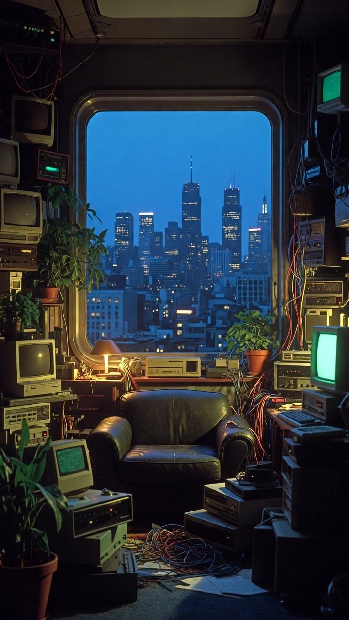 A vertical shot of a high-density apartment filled with vintage electronic equipment and glowing retro monitors. In the center, a large, rounded rectangular window looks out over a sprawling city skyline during the "blue hour," with warm skyscraper lights dotting the horizon. A black leather armchair sits in the foreground, surrounded by stacks of computer towers, CRT screens, and tangled colorful wiring. The room is warmly lit by a small desk lamp and the soft hum of green screens, while lush indoor plants add a touch of nature to this cozy, tech-heavy sanctuary.