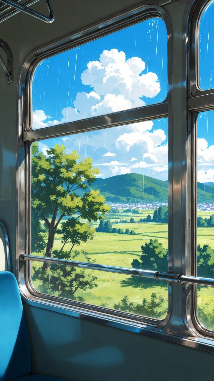 A peaceful vertical anime-style illustration capturing a scenic countryside view from the interior of a train. Large, polished windows look out onto vibrant green rolling hills and a small, distant town nestled in a valley. The sky is a brilliant blue, dominated by massive, fluffy white cumulus clouds. Delicate streaks of rain on the glass catch the bright daylight, creating a refreshing and nostalgic atmosphere. The interior of the train is rendered with clean lines, featuring soft blue seating and metallic railings, evoking a sense of quiet travel and wonder.