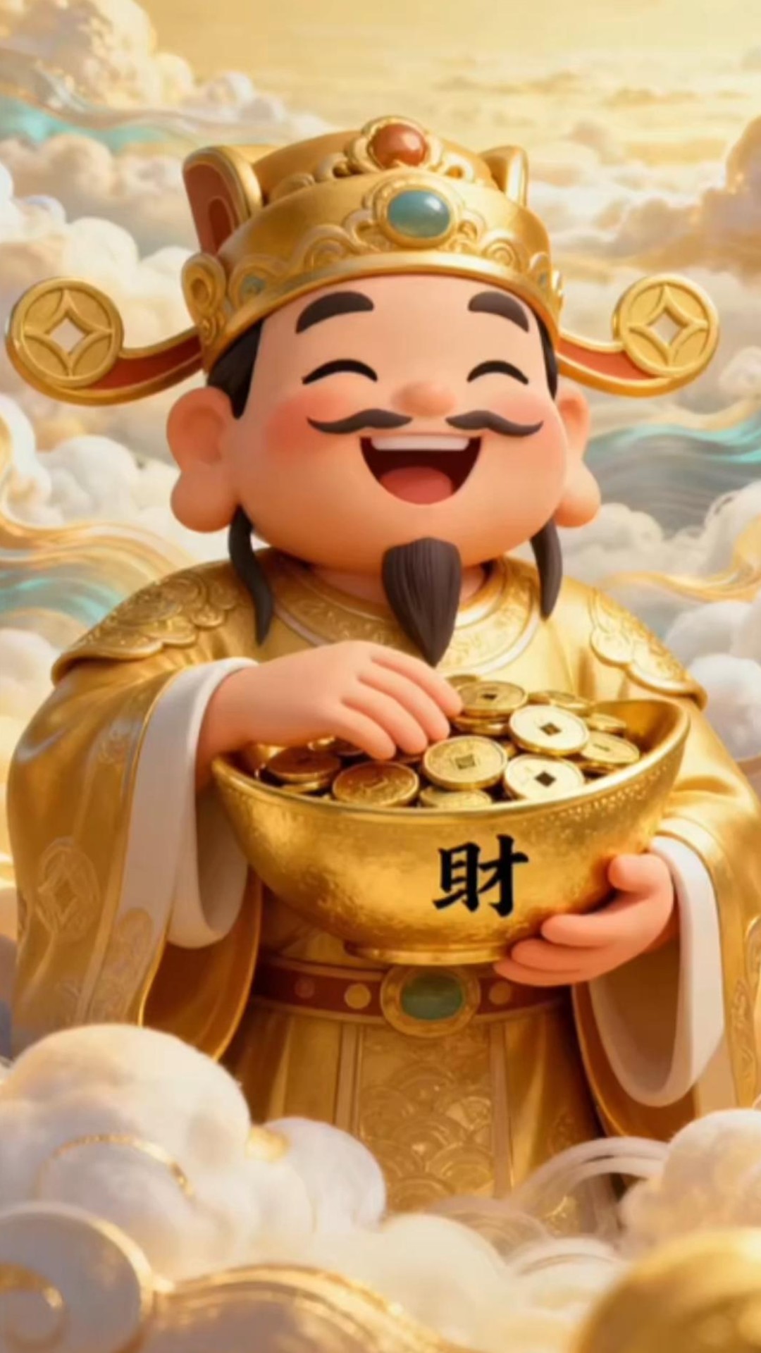 Invite abundance into your life with this delightful 3D portrayal of Caishen, the Chinese God of Wealth. Designed with a charming, high-quality animation aesthetic, this cheerful deity beams with joy while clutching a golden treasure bowl overflowing with coins. The prominent character "財" (Wealth) on the basin and the dreamy cloud backdrop make this a perfect digital talisman. It is an ideal mobile wallpaper for celebrating the Lunar New Year or simply manifesting prosperity and positivity year-round.