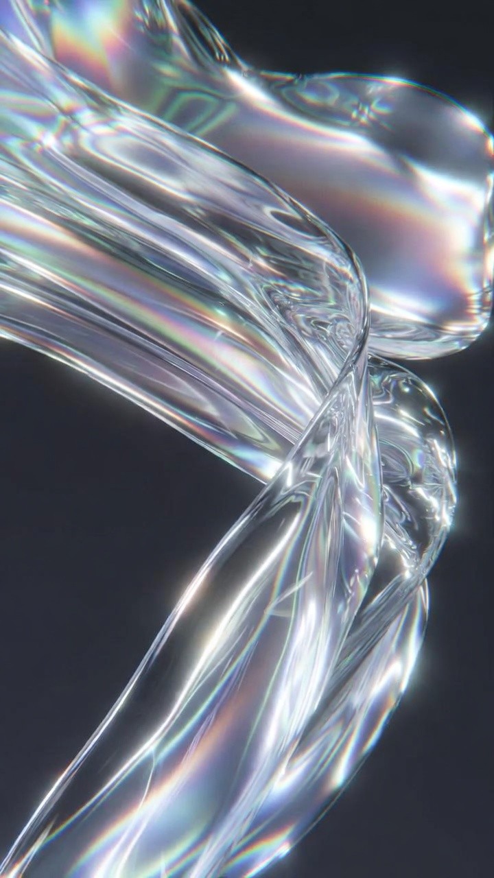 A vertical abstract composition featuring thick, twisting ribbons of transparent crystalline fluid. The surface of the ribbons is highly reflective, capturing an iridescent rainbow of colors that shimmer like oil on water or holographic glass. The background is a soft, dark charcoal grey, which makes the luminous, light-refracting properties of the fluid stand out. The curves are smooth and organic, suggesting a sense of fluid movement and high-end digital craftsmanship.